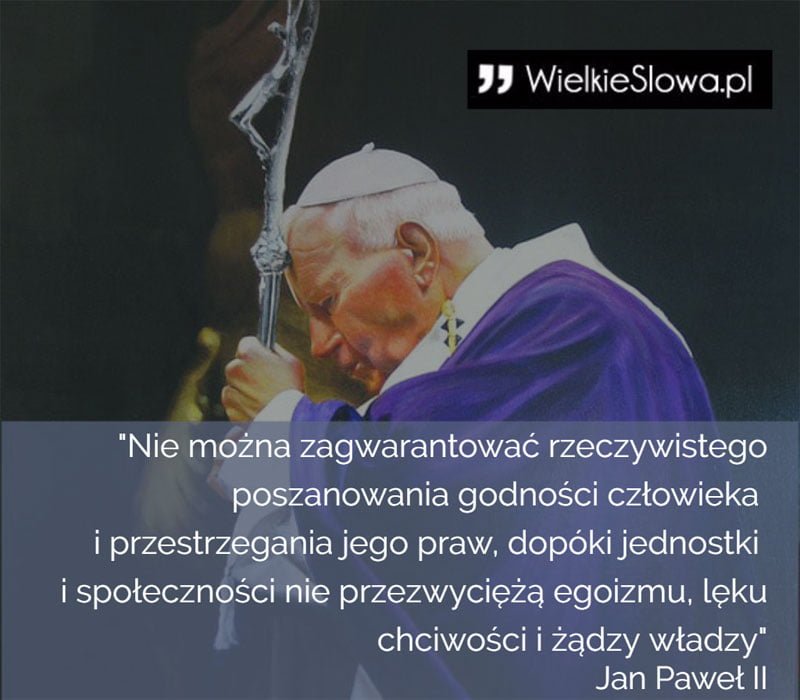„Nie można zagwarantować rzeczywistego poszanowania godności człowieka i przestrzegania jego praw, dopóki jednostki i społeczności nie przezwyciężą egoizmu, lęku chciwości i żądzy władzy” – Jan Paweł II