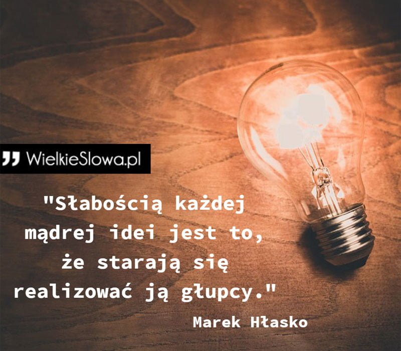 in Myślenie i myśli Słabością każdej mądrej idei jest to 408 Views Marek Hłasko – cytaty „Słabością każdej mądrej idei jest to, że starają się realizować ją głupcy” – Marek Hłasko Hłasko Marek Dodaj komentarz Anuluj pisanie odpowiedziTwój adres e-mail nie zostanie opublikowany. Wymagane pola są oznaczone *Komentarz * Nazwa * Adres e-mail * Witryna internetowa Δ Ta strona używa Akismet do redukcji spamu. Dowiedz się, w jaki sposób przetwarzane są dane Twoich komentarzy. Next post