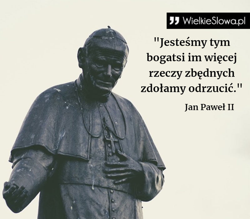 in Motywujące i inspirujące Jesteśmy tym bogatsi im więcej rzeczy zbędnych zdołamy odrzucić 543 Views Jan Paweł II – cytaty „Jesteśmy tym bogatsi im więcej rzeczy zbędnych zdołamy odrzucić” – Jan Paweł II Jan Paweł II Dodaj komentarz Anuluj pisanie odpowiedziTwój adres e-mail nie zostanie opublikowany. Wymagane pola są oznaczone *Komentarz * Nazwa * Adres e-mail * Witryna internetowa Δ Ta strona używa Akismet do redukcji spamu. Dowiedz się, w jaki sposób przetwarzane są dane Twoich komentarzy. Next post