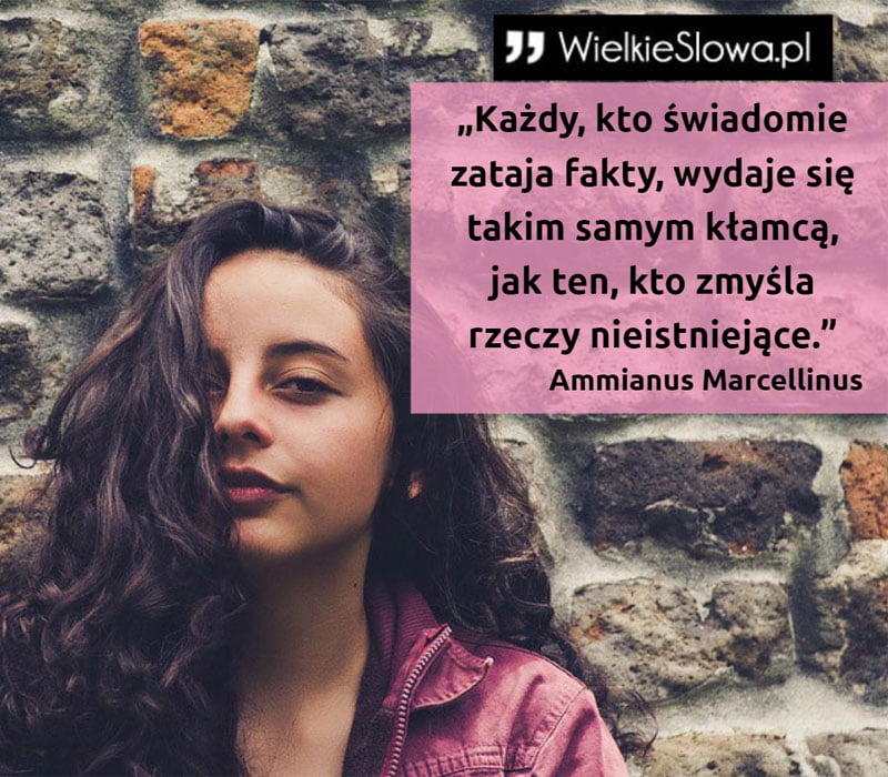 in Kłamstwo Każdy, kto świadomie zataja fakty, wydaje się takim samym kłamcą 504 Views Ammianus Marcellinus – cytaty „Każdy, kto świadomie zataja fakty, wydaje się takim samym kłamcą, jak ten, kto zmyśla rzeczy nieistniejące” – Ammianus Marcellinus Ammianus Marcellinus Dodaj komentarz Anuluj pisanie odpowiedziTwój adres e-mail nie zostanie opublikowany. Wymagane pola są oznaczone *Komentarz * Nazwa * Adres e-mail * Witryna internetowa Δ Ta strona używa Akismet do redukcji spamu. Dowiedz się, w jaki sposób przetwarzane są dane Twoich komentarzy. Next post