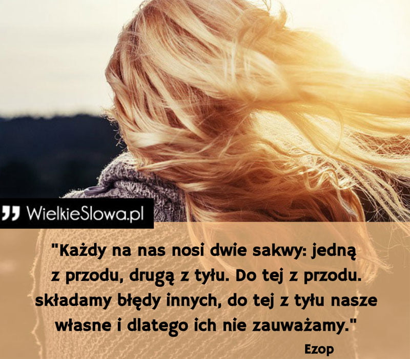 in Klęska, porażka, błędy Każdy na nas nosi dwie sakwy: jedną z przodu, drugą z tyłu 492 Views Ezop – cytaty „Każdy na nas nosi dwie sakwy: jedną z przodu, drugą z tyłu. Do tej z przodu. składamy błędy innych, do tej z tyłu nasze własne i dlatego ich nie zauważamy” – Ezop Ezop Dodaj komentarz Anuluj pisanie odpowiedziTwój adres e-mail nie zostanie opublikowany. Wymagane pola są oznaczone *Komentarz * Nazwa * Adres e-mail * Witryna internetowa Δ Ta strona używa Akismet do redukcji spamu. Dowiedz się, w jaki sposób przetwarzane są dane Twoich komentarzy. Next post