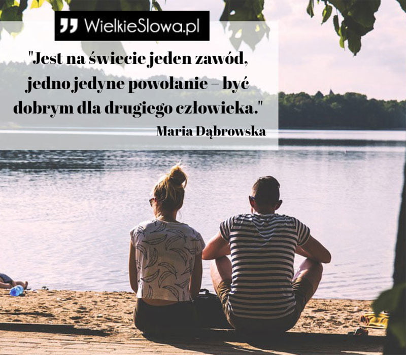 in Człowiek Jest na świecie jeden zawód, jedno jedyne powołanie 395 Views Maria Dąbrowska – cytaty „Jest na świecie jeden zawód, jedno jedyne powołanie – być dobrym dla drugiego człowieka” – Maria Dąbrowska Dąbrowska Maria Dodaj komentarz Anuluj pisanie odpowiedziTwój adres e-mail nie zostanie opublikowany. Wymagane pola są oznaczone *Komentarz * Nazwa * Adres e-mail * Witryna internetowa Δ Ta strona używa Akismet do redukcji spamu. Dowiedz się, w jaki sposób przetwarzane są dane Twoich komentarzy. Next post