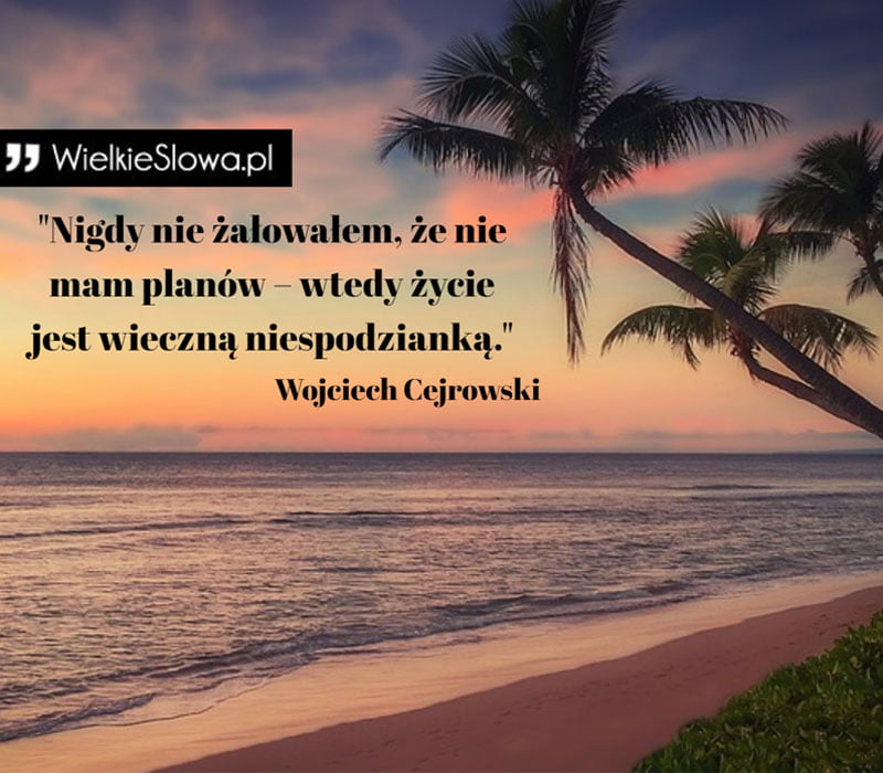 in Życie Nigdy nie żałowałem, że nie mam planów 369 Views Wojciech Cejrowski – cytaty „Nigdy nie żałowałem, że nie mam planów – wtedy życie jest wieczną niespodzianką” – Wojciech Cejrowski Cejrowski Wojciech Dodaj komentarz Anuluj pisanie odpowiedziTwój adres e-mail nie zostanie opublikowany. Wymagane pola są oznaczone *Komentarz * Nazwa * Adres e-mail * Witryna internetowa Δ Ta strona używa Akismet do redukcji spamu. Dowiedz się, w jaki sposób przetwarzane są dane Twoich komentarzy. Next post