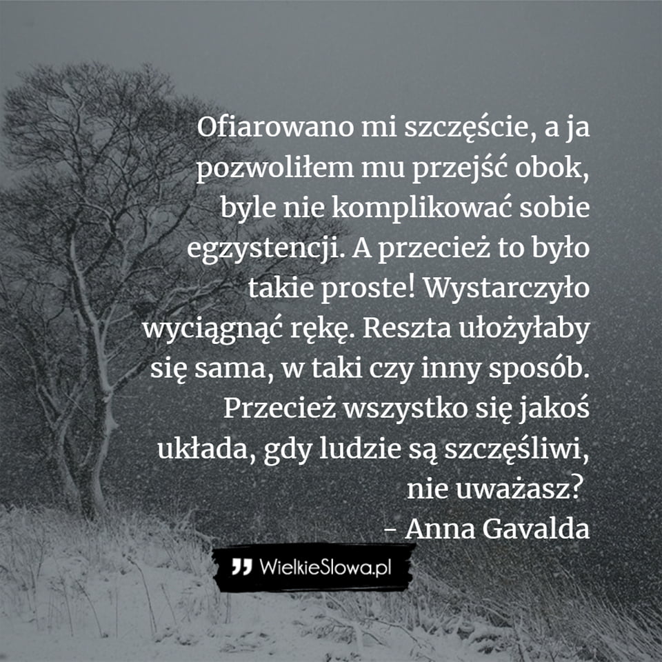 Ofiarowano mi szczęście, a ja pozwoliłem mu przejść obok, byle nie komplikować sobie egzystencji. A przecież to było takie proste! Wystarczyło wyciągnąć rękę. Reszta ułożyłaby się sama, w taki czy inny sposób. Przecież wszystko się jakoś układa, gdy ludzie są szczęśliwi, nie uważasz?