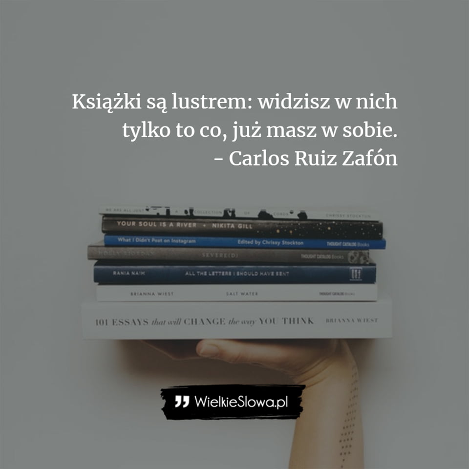 in Książki Książki są lustrem 464 Views Carlos Ruiz Zafón – cytaty Książki są lustrem: widzisz w nich tylko to co, już masz w sobie. – Carlos Ruiz Zafón Zafón Carlos Ruiz Dodaj komentarz Anuluj pisanie odpowiedziTwój adres e-mail nie zostanie opublikowany. Wymagane pola są oznaczone *Komentarz * Nazwa * Adres e-mail * Witryna internetowa Δ Ta strona używa Akismet do redukcji spamu. Dowiedz się, w jaki sposób przetwarzane są dane Twoich komentarzy. Next post