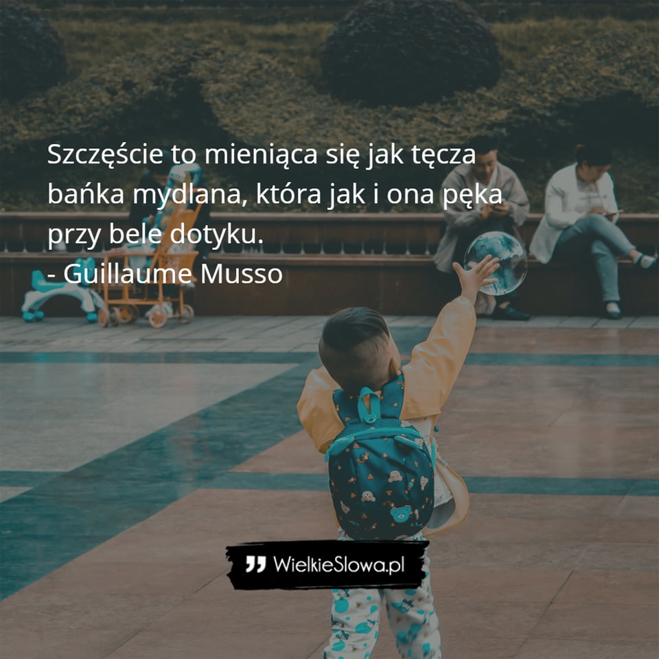 in Szczęście Szczęście to mieniąca się 310 Views Guillaume Musso – cytaty Szczęście to mieniąca się jak tęcza bańka mydlana, która jak i ona pęka przy bele dotyku. – Guillaume Musso Musso Guillaume Dodaj komentarz Anuluj pisanie odpowiedziTwój adres e-mail nie zostanie opublikowany. Wymagane pola są oznaczone *Komentarz * Nazwa * Adres e-mail * Witryna internetowa Δ Ta strona używa Akismet do redukcji spamu. Dowiedz się, w jaki sposób przetwarzane są dane Twoich komentarzy. Next post