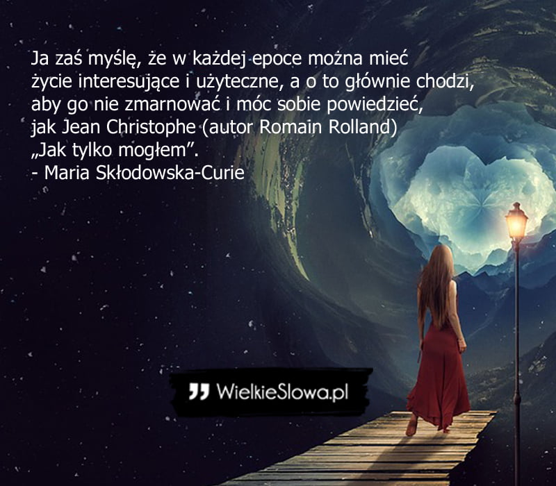 Ja zaś myślę, że w każdej epoce można mieć życie interesujące i użyteczne, a o to głównie chodzi, aby go nie zmarnować i móc sobie powiedzieć, jak Jean Christophe (autor Romain Rolland) „Jak tylko mogłem”.