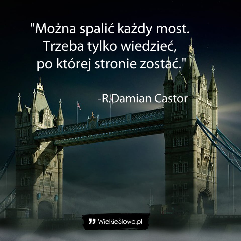 in Relacje międzyludzkie Można spalić każdy most… 518 Views R.Damian Castor – cytaty „Można spalić każdy most. Trzeba tylko wiedzieć, po której stronie zostać.”– R.Damian Castor Castor R. Damian Dodaj komentarz Anuluj pisanie odpowiedziTwój adres e-mail nie zostanie opublikowany. Wymagane pola są oznaczone *Komentarz * Nazwa * Adres e-mail * Witryna internetowa Δ Ta strona używa Akismet do redukcji spamu. Dowiedz się, w jaki sposób przetwarzane są dane Twoich komentarzy. Next post