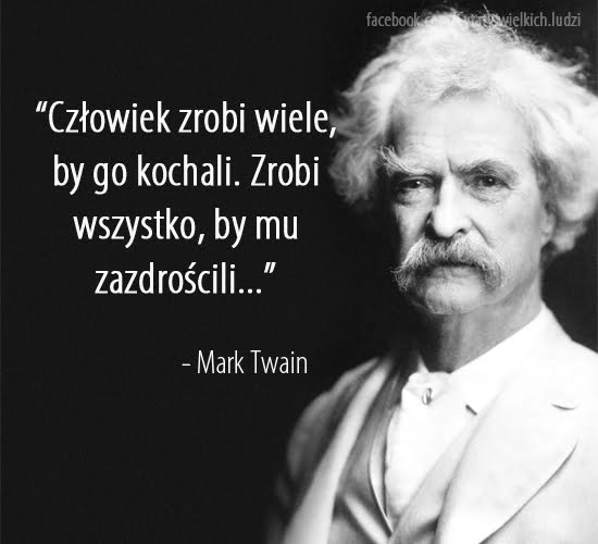 in Człowiek, Miłość, Zazdrość Człowiek zrobi wiele, by go kochali… 483 Views 4 komentarze Człowiek zrobi wiele, by go kochali. Zrobi wszystko, by mu zazdrościli. Mark Twain Twain Mark 4 Komentarzy Leave a Reply Bzdura!! Nie chce żeby mi ktoś zazdrościł bo to zazwyczaj nic dobrego nie wróży! Odpowiedz „Człowiek zazdrosny jest tak udręczony szczęściem drugiego, że zadaje sobie rany na swej własnej cierpiącej duszy” (Św. Grzegorz Wielki) – Wolę się trzymać tego cytatu ;) Odpowiedz Zazdrość, zawiść to okropne cechy ludzkie. Nikomu, niczego nie zazdroszczę, cieszę się jak innym się układa. Odpowiedz Bzdura .. po co komu czyjaś zazdrość…? Odpowiedz Dodaj komentarz Anuluj pisanie odpowiedziTwój adres e-mail nie zostanie opublikowany. Wymagane pola są oznaczone *Komentarz * Nazwa * Adres e-mail * Witryna internetowa Δ Ta strona używa Akismet do redukcji spamu. Dowiedz się, w jaki sposób przetwarzane są dane Twoich komentarzy. Next post