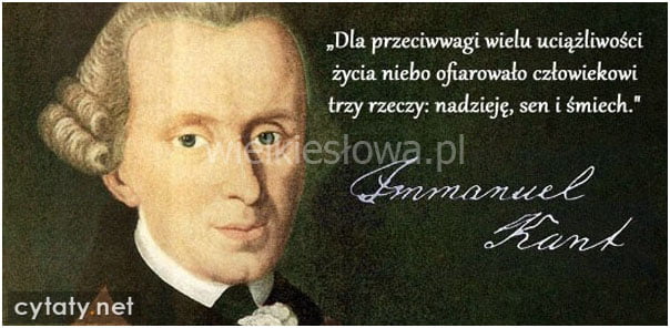 Immanuel Kant (1724-1804) – niemiecki filozof oświeceniowy, profesor logiki i metafizyki na Uniwersytecie Królewieckim. Jest twórcą filozofii krytycznej zakłądającej, że podmiot jest poznawczym warunkiem przedmiotu. Zniósł opozycje pomiędzy racjonalizmem, a empiryzmem.