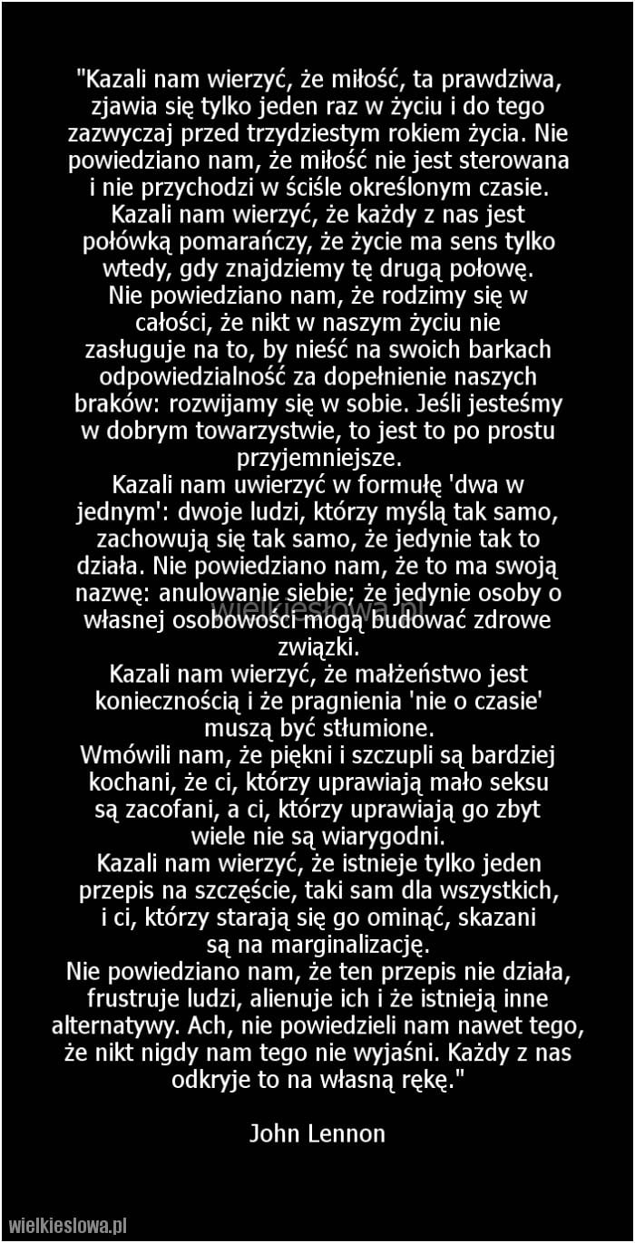 John Lennon (1940-1980) – brytyjski muzyk, kompozytor, wokalista i autor tekstów, członek zespołu The Beatles. Umieszczony w pierwszej dziesiątce artytstów wszech czasów na liście 100 najważniejszych Brytyjczyków. W 1969 roku po odejściu Paula Mccartneya i rozwiązaniu The Beatles rozpoczął karierę solową. Jego najbardziej znanym albumem salowym jest „Imagine”, z którego pochodzi tytułowy utwór będący hymnem pacyfistów. w 1971 po przeprowadzce do Stanów Zjednoczonych zaczał zajmować się w polityką, angażował się w wiele kampanii m.in. na rzecz praw Indian, protesty przeciwko uwięzieniu radykalnych działaczy politycznych co doprowadziło do inwigilacji go przez FBI. chcięto go nawet deportować z USA ale dzięki wsparciu poważnych amerykańskich obywateli został. Problemy małżeńskie i uzależnienie od heroiny sprawiły, że wycofał się z życia publicznego. Jego album „Double Fantasy” wydany po latach zaskakiwał odbiorców ciepłem i optymizmem. Wkrótce po tym został postrzelony 4 krotnie w bramie swego domu na Manhattanie przez Marka Davida Chapmana. Lennon zmarł, a Chapman trafił do więzienia i odbywa kare dożywotniego pozbawienia wolności. Jego pogrzeb zgromadził 100 tys osób, śpiewających jego piosenki i kontemplując w ciszy jego dorobek.